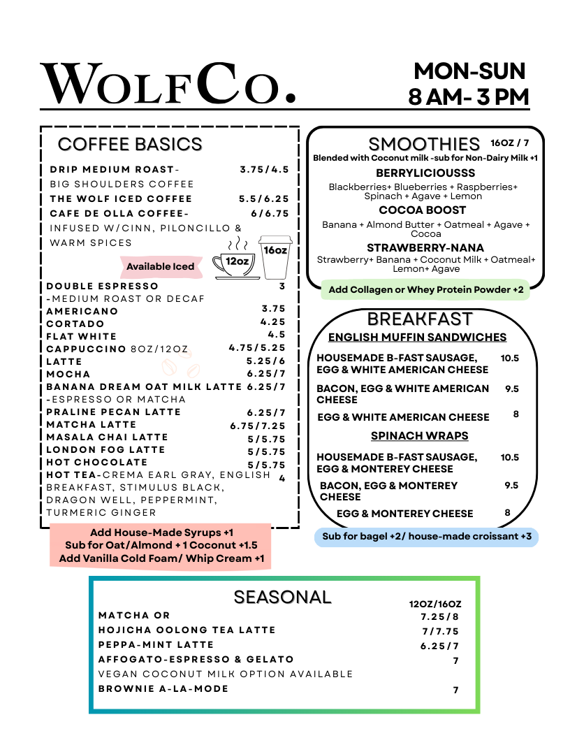 Wolf & Company Café is a neighborhood destination where craft and quality meet your daily ritual. Our menu features expertly prepared lattes with house-made syrups, refreshing teas, cold-pressed juices, and seasonal beverages made from the finest ingredients.